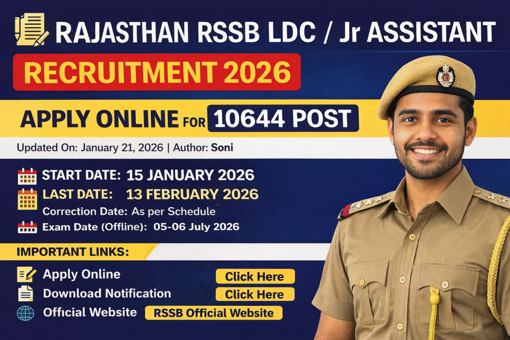 Rajasthan Staff Selection Board (RSSB) ने LDC / Junior Assistant के 10644 पदों पर भर्ती के लिए ऑनलाइन आवेदन आमंत्रित किए हैं। इच्छुक अभ्यर्थी 15 जनवरी 2026 से 13 फरवरी 2026 तक ऑनलाइन आवेदन कर सकते हैं।